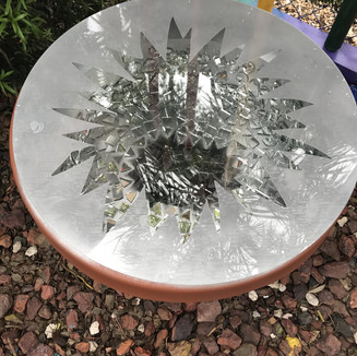 My creation consisted of a multi-tiered Plexiglas sculptural piece inside of a planter. I opted to keep the planter its normal neutral color and paint the inside of the vessel a metallic silver color to further bring out the mystical experience that the mirrors reflect and create. The piece is made up of over five hundred broken pieces of mirrors. I wanted to use mirrors because I always find it an adventure to set up and explore different venues of an art piece with mirrors. As we know, mirrors reflect the objects surrounding it. I tried setting up my piece inside, outside, with bright lights, and in the darkness. Every single location created a very different environment within my miniature piece. However, regardless of the location, the feeling of looking over the edge of the cliff continued to loom.